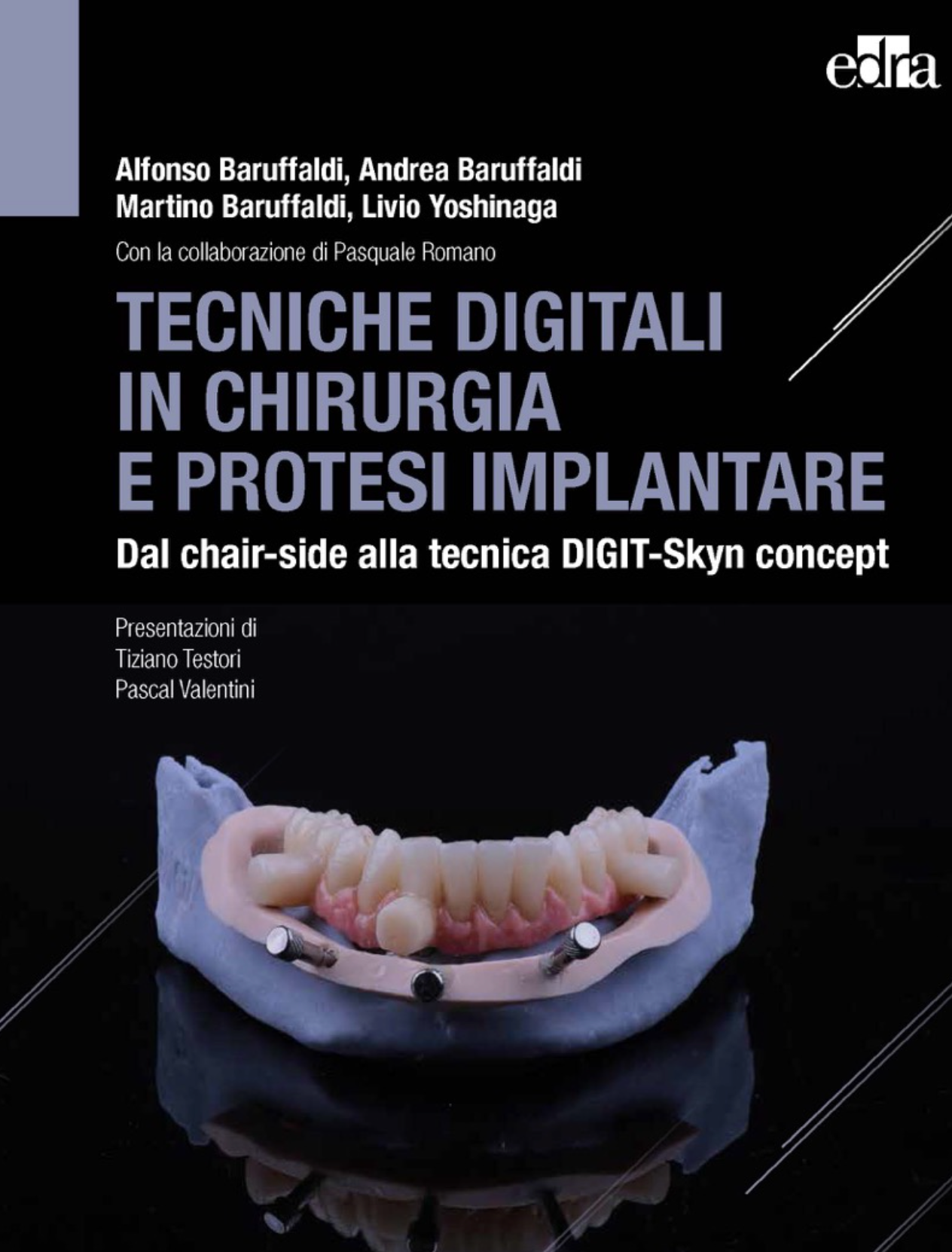 Sono illustrate la tecnica implanto-protesica DIGIT (DENTAL IMPLANT GUIDED IMMEDIATE THERAPY), utilizzata primariamente per la riabilitazione fissa di arcate complete mediante protesi sostenute da impianti con intervento chirurgico a cielo coperto, e lo Skyn concept, coinvolgendo il carico immediato, oggi indispensabile nella pratica della moderna odontoiatria. Paragonando le tecniche tradizionali a quelle innovative digitali il testo fornisce un flusso di lavoro sulla protesi fissa a carico immediato molto più ripetibile e facile da applicare per l’odontoiatria di tutti i giorni.